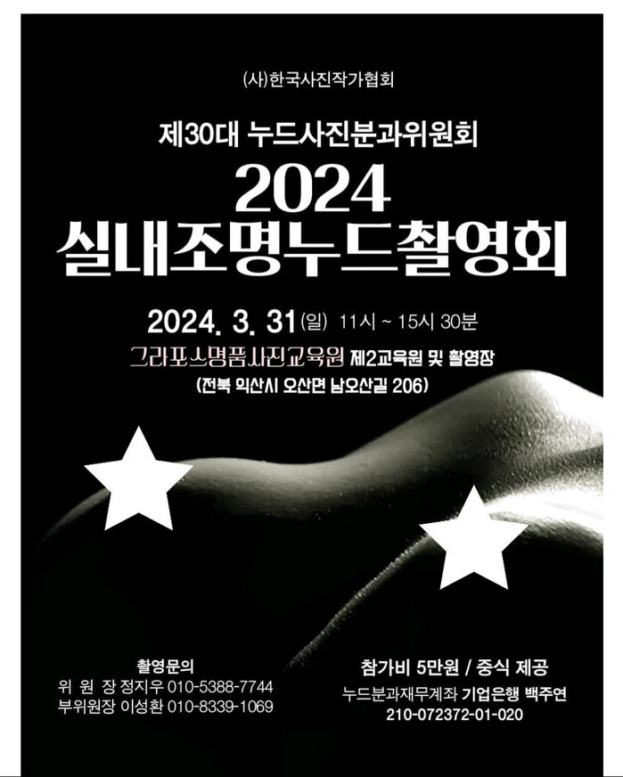 | ▲ (사)한국사진작가협회(이하 사협) 누드사진분과(위원장,정지우)에서 주최하는 <2024 실내조명누드촬영회>가 오는 3월 31(일)일 익산에서 개최한다. |