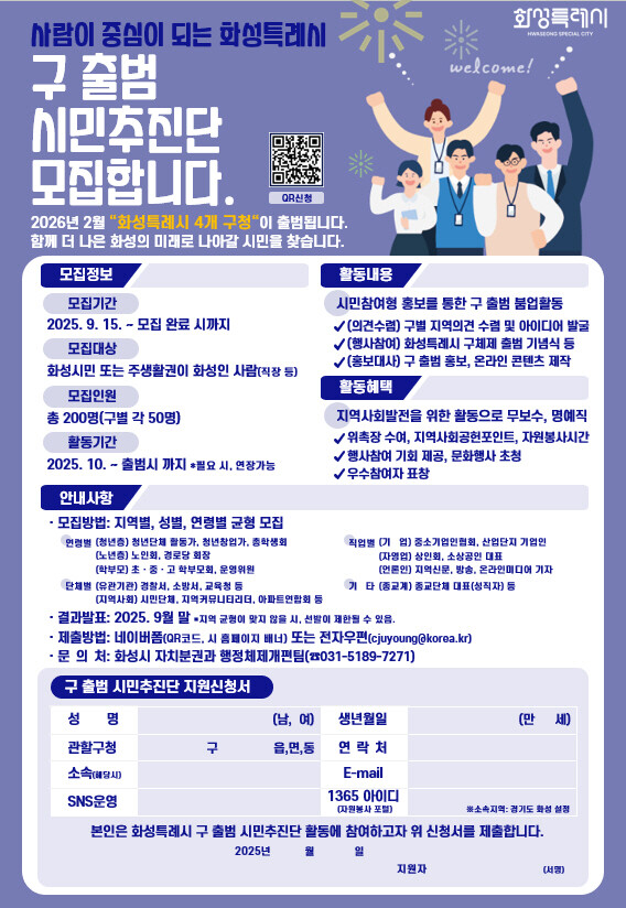 [화성=송윤근 기자] 경기 화성특례시(시장 정명근)는 2026년 2월 1일 4개 일반구 출범을 앞두고 시민과 함께하는 참여형 행정 구현을 위해 ‘구 출범 시민추진단’을 공개 모집한다고 19일 밝혔다.