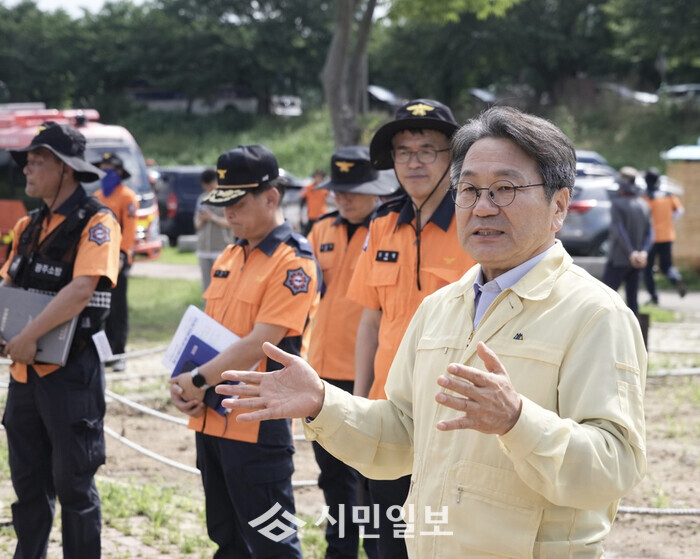 | ▲ 강기정 광주광역시장이 22일 서구 극락교를 찾아 집중호우로 인한 실종자 집중수색을 앞두고 있는 대원들의 안전을 당부하고 있다. /광주광역시 제공 |
