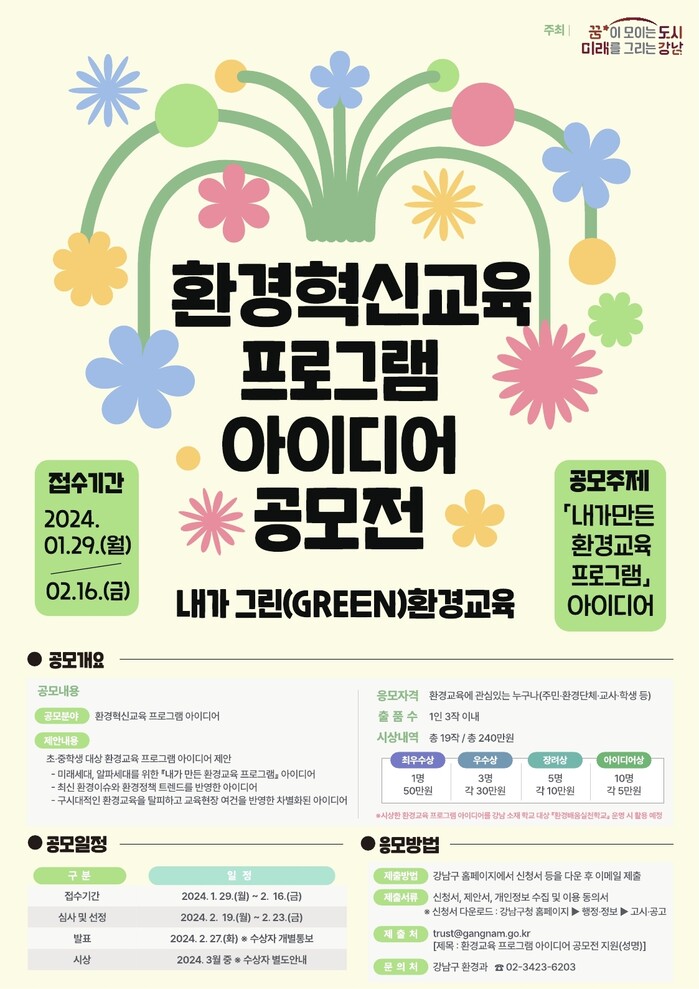 참가 신청은 구청 홈페이지에서 신청서를 내려받은 후 프로그램 제안서, 개인정보 수집·이용 동의서 및 서약서를 이메일(trust@gangnam.go.kr)로 제출하면 된다.