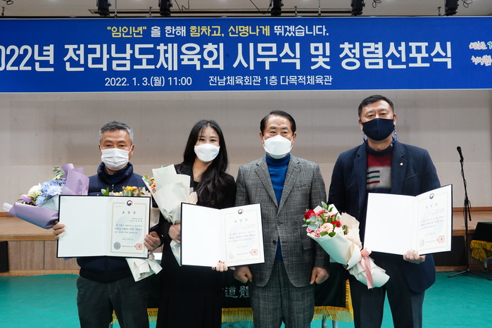 이들 수상자들은 3일 전라남도체육회 2022년 시무식 및 청렴선포식에서 김재무 전라남도체육회장으로부터 문화체육관광부장관상 표창장을 전달받았다.