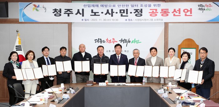 이와 함께 최근 사회적으로 점점 중요성이 커지고 있는 안전과 관련해 산업재해를 예방하고 안전한 일터를 조성하기 위해 ▲자율 안전관리 실천 ▲안전보건 교육 여건 마련 ▲안전보건 문화 확산 ▲안전한 산업현장 조성 지원을 위한 협력체계 구축 등 노사민정이 함께 최선의 노력을 다할 것을 다짐하는 ‘청주시 노사민정 공동선언문’을 채택했다.
