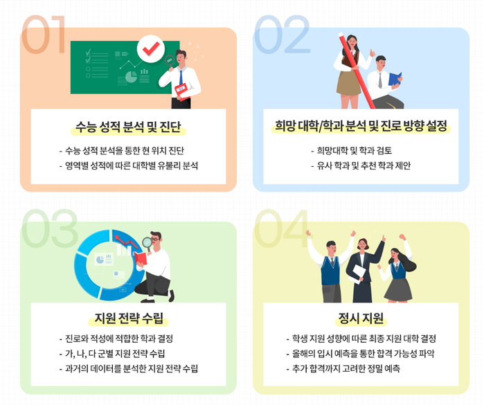 특히, 정시 군별 지원 전략과 추가 합격 가능성까지 예측 분석하여 보다 체계적이고 신뢰도 높은 지원 계획을 제공한다. 이를 통해 학생들이 합리적인 결정을 내리고 성공적인 대학 진학을 이룰 수 있도록 돕는다.
