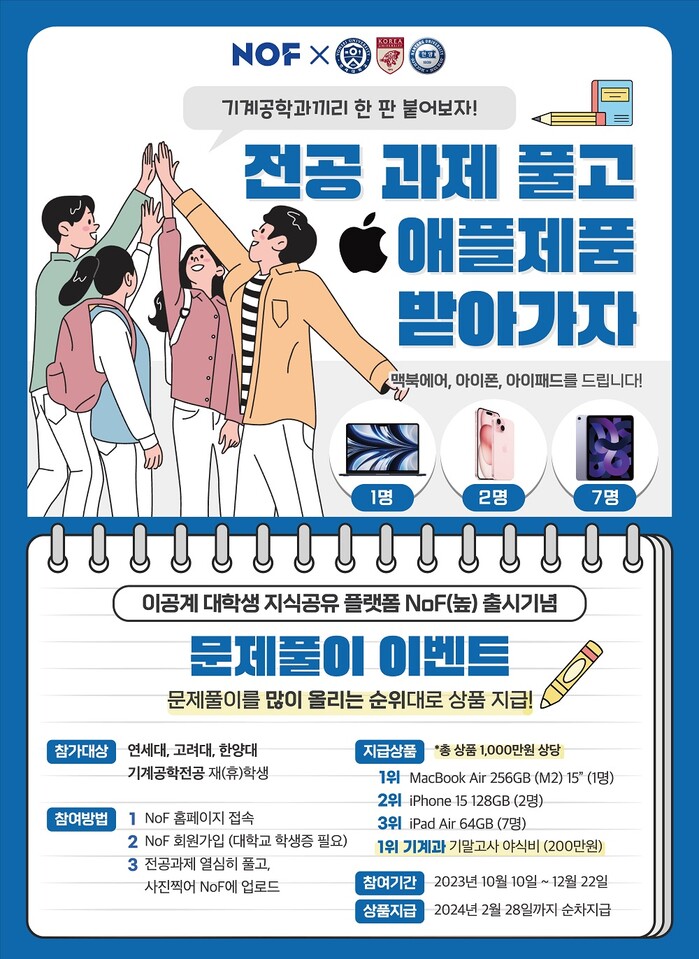 베타서비스 기간인 10월 10일부터 12월 22일까지 진행되는 해당 이벤트에서는 세 학교 기계공학과 중 전공서적의 연습문제 풀이과정을 가장 많이 올린 학교에게 2백만원 상당의 야식을 제공한다. 개인랭킹 상위권(1위~10위) 학생들에게 총 1천만원 상당의 애플 제품을 증정할 예정이다.