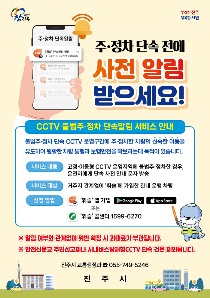 진주시는 지난 4월 1일부터 불법 주·정차에 따른 시민들의 불편을 해소하고 원활한 교통소통을 위해 도입한 불법 주정차 단속 사전 알림서비스인 ‘휘슬’이 시민들의 많은 관심 속에 성공적으로 운영되고 있다고 밝혔다.