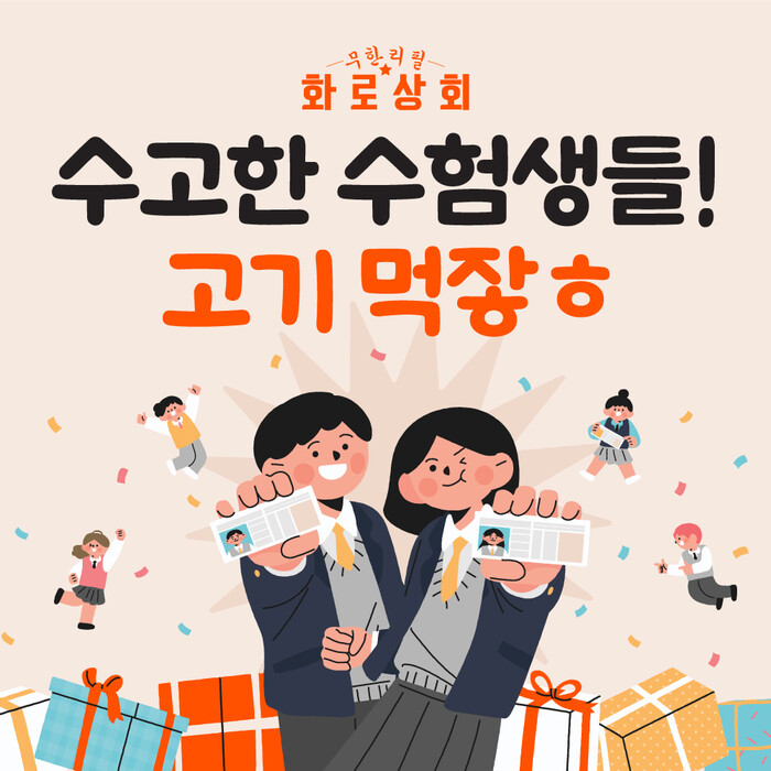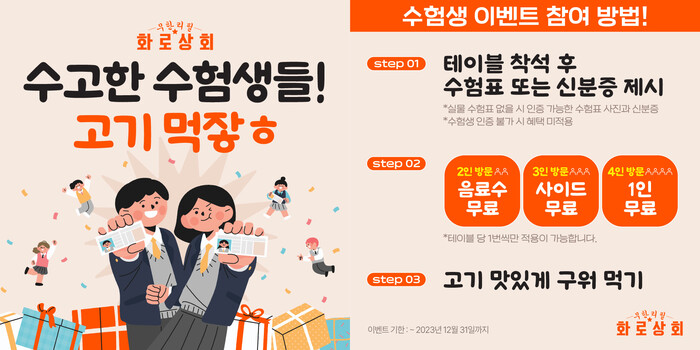 화로상회 관계자는 “11월16일부터 12월 31일까지 수험표를 지참한 수험생이 포함된 테이블에 4명이 방문시 1명 무료 식사를 제공한다"며 "이번 이벤트는 전 가맹점이 아닌 미아1호점, 광운대점, 구리인창점, 목동1호점에서만 진행한다"고 밝혔다.