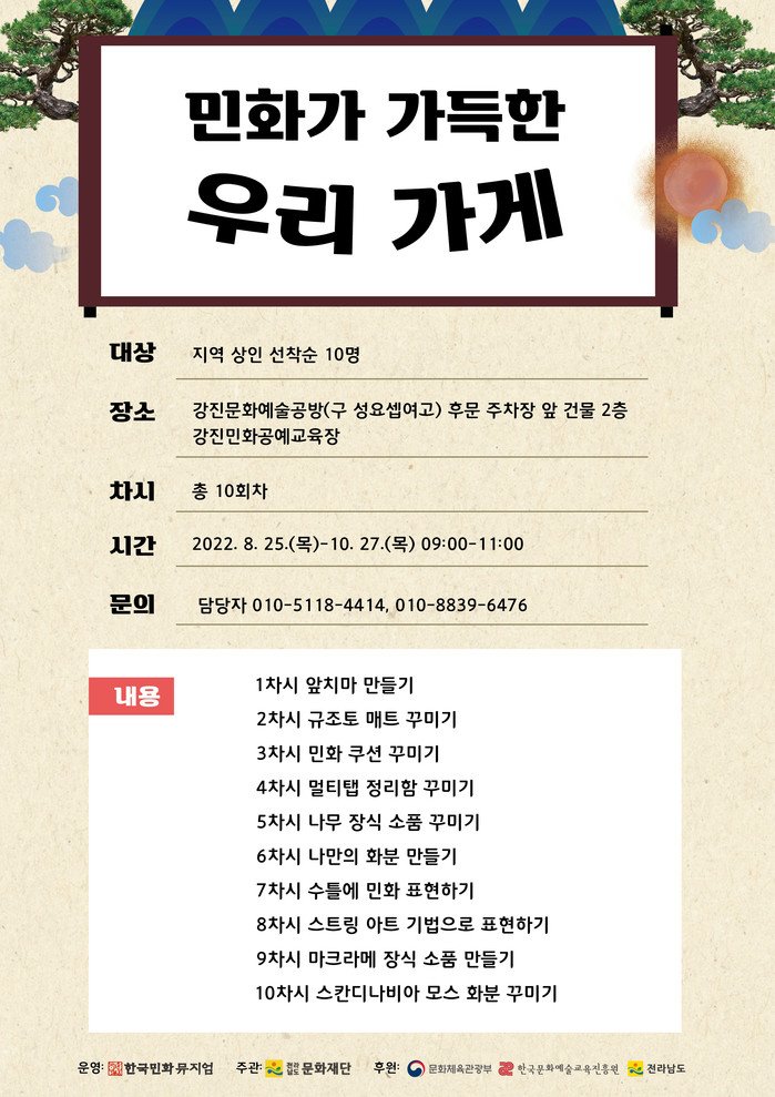 장소는 강진문화예술공방(구 성요셉여고) 후문 주차장 앞 건물 2층 강진민화공예교육장이며, 기간은 오는 25일부터 10월 27일까지 총 10회 차 프로그램을 진행한다.