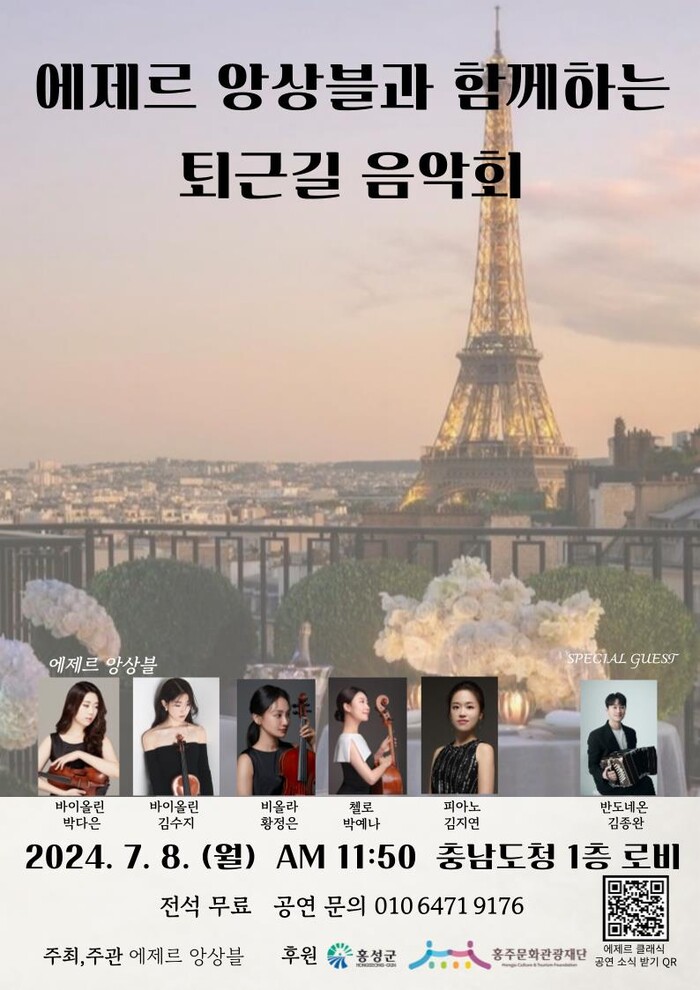 [홍성=최복규 기자] 충남 홍성군이 홍주문화관광재단의 2024년도 지역문화예술지원사업의 일환으로, 8일 오전 11시50분 충남도청 1층 로비에서 에제르앙상블과 함께하는 제1회 퇴근길 음악회를 개최한다.