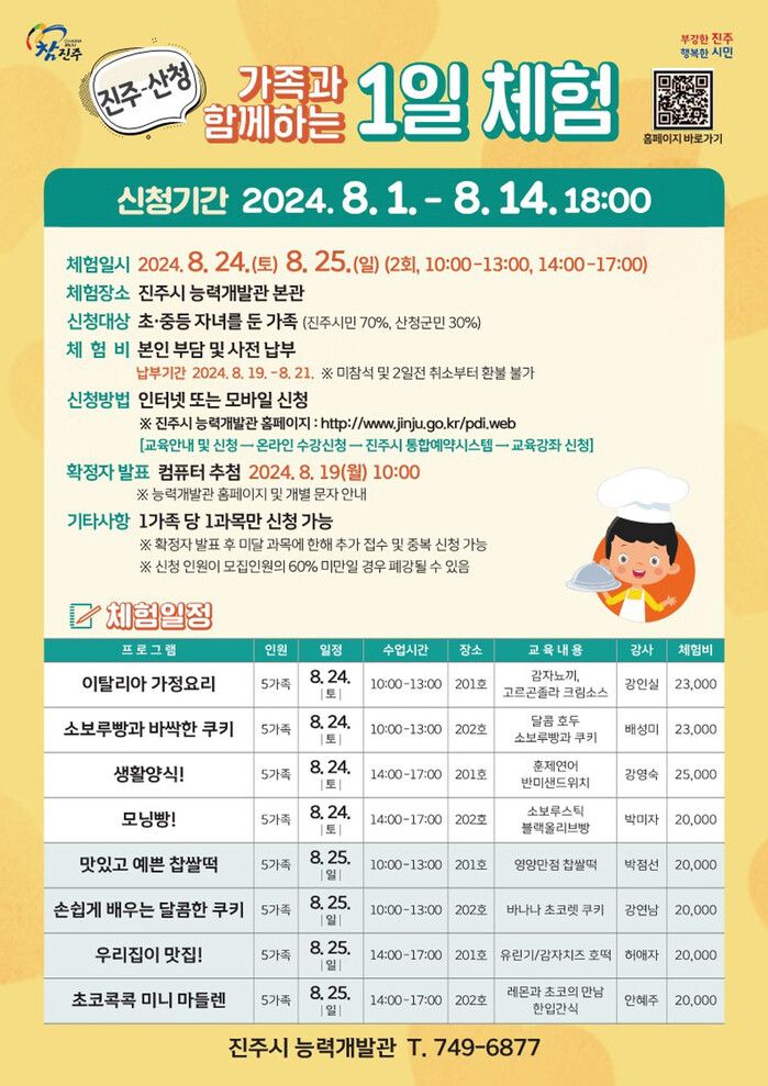 이번 체험행사는 8개 프로그램별 5가족씩 모집하여 진주·산청에 거주하는 40가족 160여 명과 함께 할 계획이며, 8월 24일과 25일 양일간 오전 10시~오후 1시 수업과 오후 2시~5시 수업으로 나눠 시간별 2개 프로그램씩 운영한다. 체험 프로그램은‘이탈리아 가정요리’,‘소보로빵과 쿠키’,‘양식요리’등 인기있는 요리를 주제로 전문 강사의 지도하에 진행할 예정이다.