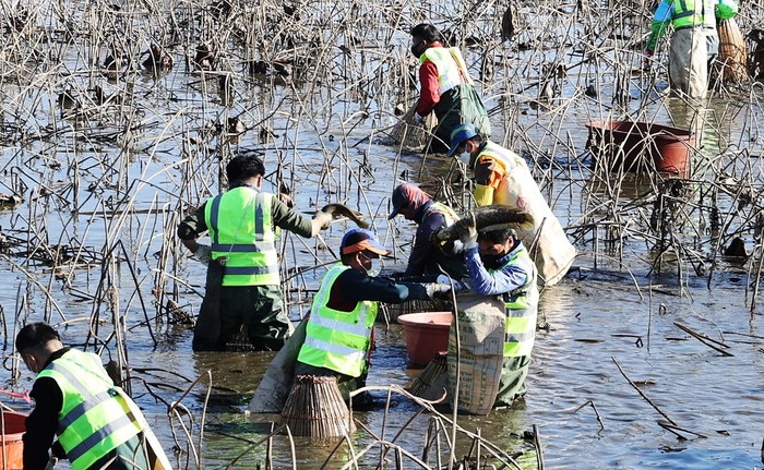 | ▲ 강진군 병영면 지역주민들이 중고저수지 연방죽에서 매년 개최되고 있는 전통 농어업유산인 대나무 통발을 이용한 가래치기로 민물고기 잡기를 하고 있다. / 사진=강진군 제공 |