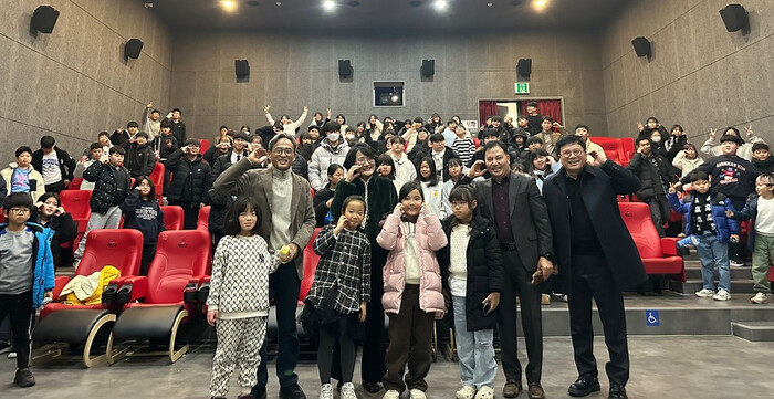 | ▲ 이자영 해남교육지원청 교육장(뒷 줄 왼 쪽부터 두 번째)가 오연호 꿈들이에 이사장 및 오마이뉴스 대표, 김혜일 꿈틀리학교장, 초등학생 등과 지난 17일 해남시네마에서 기념촬영을 하고 있다. / 해남교육지원청 제공 |