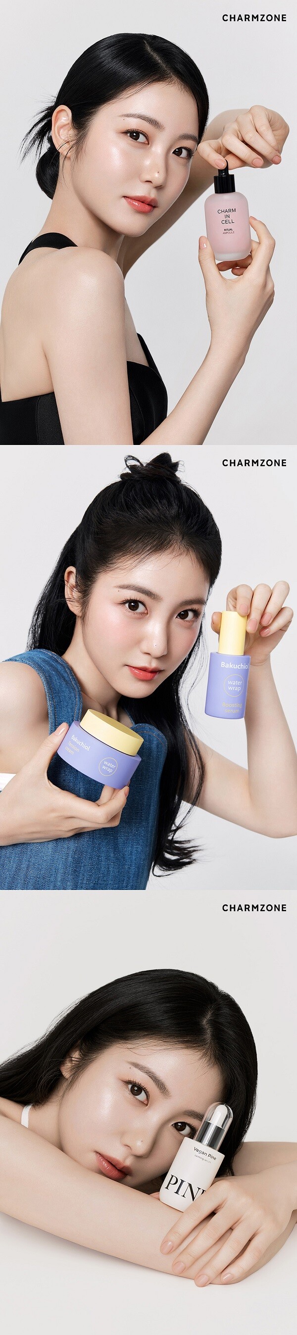 화보 속 ‘비건파인 카밍 세럼’은 청정 제주 솔잎 추출물을 함유하여 단 1회 사용으로 흔적·붉은기 진정, 거칠어진 피부결 정돈이 가능한 비건 스킨케어 제품이다. ‘참인셀 리추얼 앰플’은 참존 최고의 프리미엄 브랜드 ‘참인셀’의 토탈 항산화 케어 라인으로, 산뜻한 저자극 제형의 안티에이징 루틴을 원하는 분들에게 적합하다. ‘바쿠치올 워터랩 부스팅 세럼’과 ‘바쿠치올 워터랩 텐션 크림’은 99% 고순도 바쿠치올을 함유하여 피부 탄력 개선에 자극 없는 안티에이징 케어가 가능한 스킨케어 듀오 제품이다.
