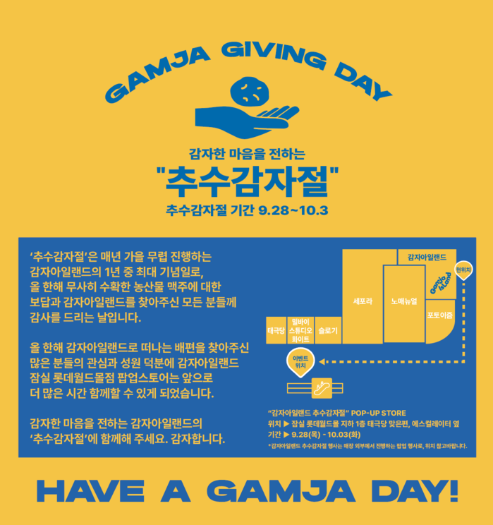 브랜드 관계자는 “이번 추수감자절 행사를 통해, 고객분들의 성원에 의한 기존 롯데월드몰 팝업의 기간 연장과 많은 관심에 보답하고자 한다.” 고 말했다.