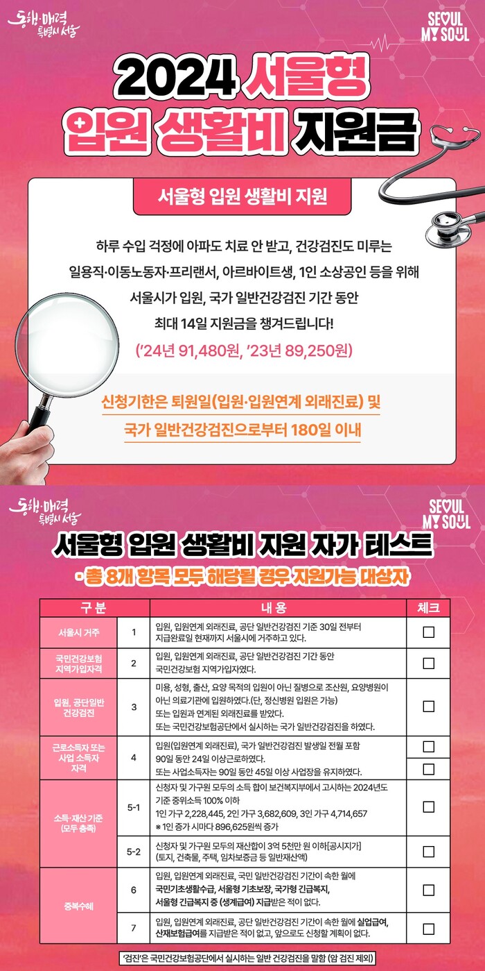 서울형 입원 생활비 지원제도는 하루 수입 걱정에 아파도 치료를 받지 않거나 건강검진을 미루는 일용직·특수고용·프리랜서, 아르바이트생, 1인 소상공인 등을 위해 입원(입원연계 외래진료), 국가 일반건강검진 기간 동안 1일 9만1480원, 연 최대 14일까지 입원 생활비를 지원하는 사업이다.
