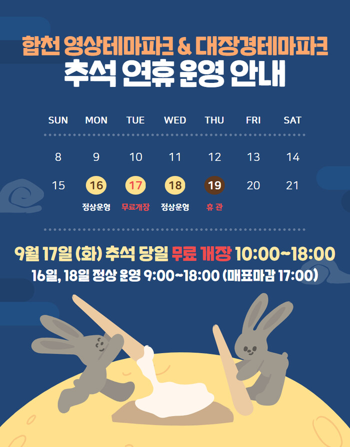 김윤철 군수는 “사랑하는 가족과 함께 명절을 보내기에 더없이 좋은 기회가 될 것”이라며, “추석 연휴 동안 합천영상테마파크와 대장경테마파크를 방문하여 특별한 하루를 보내시길 바란다”고 말했다.