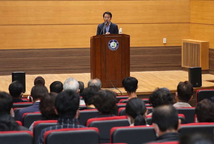 | ▲ 강진원 강진군수가 지난 10월31일 강진군농업기술센터 대강당에서 열린 관내 농업인 150여 명 대상으로 농가 소득 향상을 위한 농산물 품목별 브랜드화 핵심 전략 주제 교육에 참석해 인사말을 하고 있다. / 사진=강진군 제공 |
