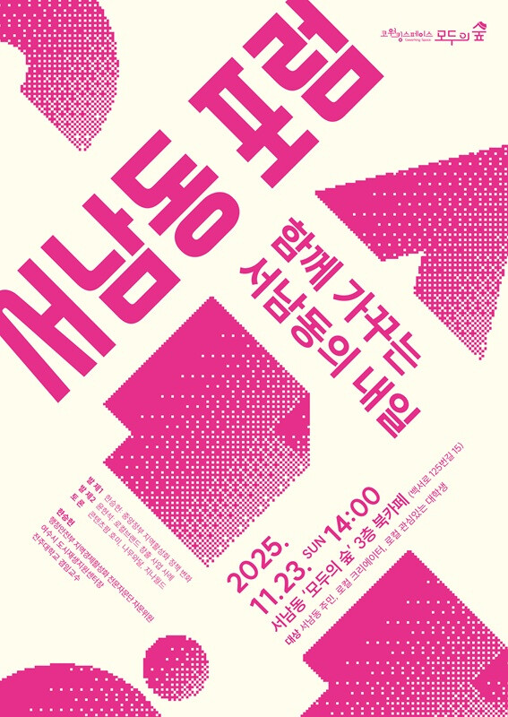 ‘서남동 포럼’은 지역 주민, 로컬 크리에이터, 청년 창업가, 대학생 등 누구나 참여 가능하며, 기타 자세한 사항은 도시공간계획과로 문의하면 된다.