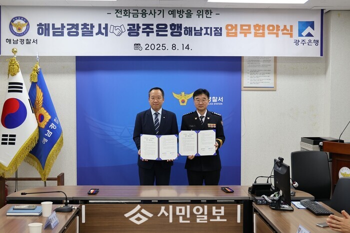 [해남=정찬남 기자] 전남 해남경찰서(서장 안형주)와 광주은행 해남지점(지점장 김일국)은 지난 14일 해남경찰서에서 전화금융사기 예방과 지역사회 금융거래 안전망 강화를 위한 업무협약(MOU)을 체결했다.