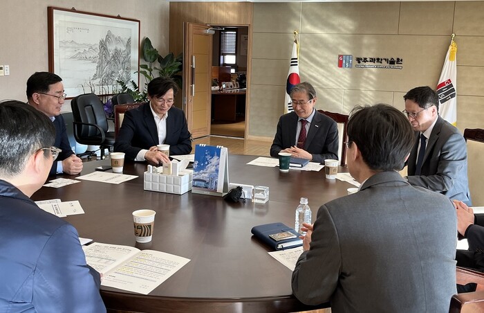 | ▲ 우승희 영암군수(왼 쪽 세 번째)가 지난 2월 28일 광주과학기술원을 방문해 임기철 총장을 예방한 자리에서 영암군의 미래 신성장 동력 확보 등에 대한 상호협력 체제 구축을 논의하고 있다. / 영암군 제공 |