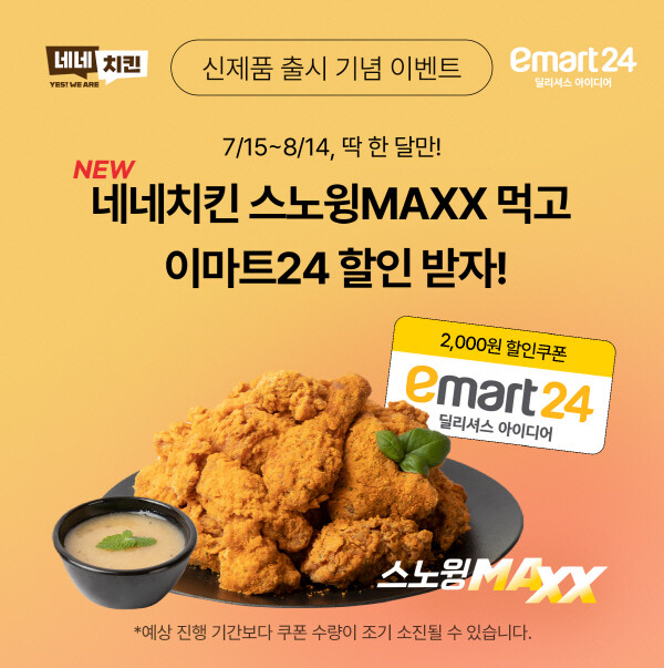 또한, 이마트 24에서 복날 상품 40종을 사면 추첨을 통해 총 2400명에게 네네치킨 시그니처 신메뉴 ‘스노윙MAXX’ 쿠폰 3종을 랜덤으로 증정한다.
