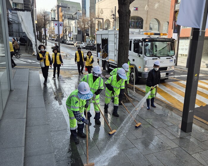 이날 행사에는 동주민센터 직원, 청소업체 등 약 30명이 참여했다. 가로수길에서는 오전 9시부터 물청소차 1대, 보도 얼룩 및 껌딱지 제거차 2대, 환경미화원 10명이 가로수길 양측 보도 위의 얼룩과 껌딱지, 묵은 때 등을 제거했다.