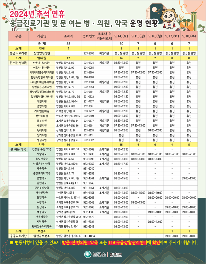합천군 내 응급의료기관으로는 삼성합천병원이 24시간 응급실을 운영하여 연휴 기간에도 진료를 제공한다. 이와 함께 문 여는 병·의원 15개소와 약국 15개소, 합천읍 보건소 1개소(9.17.~9.18.)가 지정되어 운영될 예정으로, 상세한 운영 정보는 보건소 및 군청 홈페이지, 응급의료포털, 스마트폰 앱에서 확인할 수 있다.