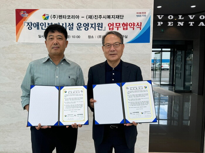 ㈜펜타코리아(대표 조원찬)와 (재)진주시복지재단(이사장 이성갑)은 지난 26일 진주시 정촌면 소재 ㈜펜타코리아 회의실에서 관내 취약한 장애인복지시설 운영지원을 위한 업무협약식(MOU)을 가졌다.