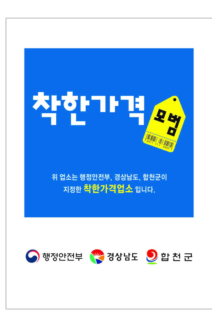 합천군은 현재 44개소의 착한가격업소를 지정·관리하고 있으며, 해당업소에는 착한가격업소 표찰을 부착하고 지역물가 안정화에 기여하는 인센티브로 상수도 요금 30% 감면, 종량제봉투 지원, 공공요금 등을 지원하고 있다.