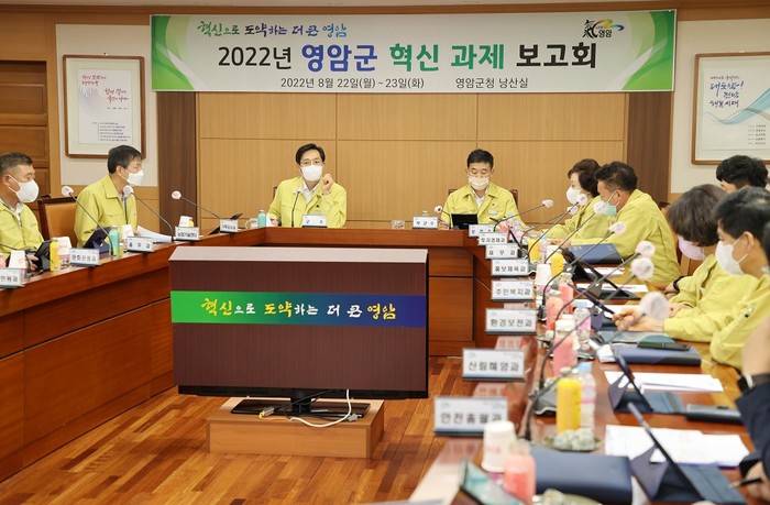 | ▲ 지난 22~23일 영암군청 낭산실에서 우승희 영암군수 주재로 열린 2022년 영암군 혁신 과제 보고회 모습 / 영암군 제공 |