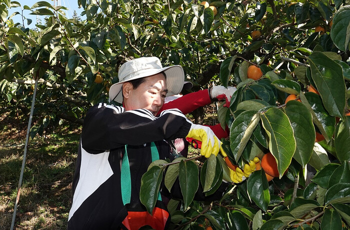 | ▲ 대합면 단감농장에서 가을철 농촌일손돕기를 실시했다 |