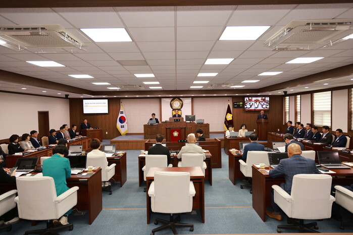 정봉훈 의장은 개회사를 통해 “제2회 추가경정예산안을 비롯한 의안 심사에 있어 군민의 복리 증진을 최우선으로 해 주시기 바란다”며 “다가오는 추석명절에는 극한호우로 피해를 입은 군민들께서도 따뜻하고 풍성한 명절을 보낼수 있도록 세심히 살펴달라”고 당부했다.