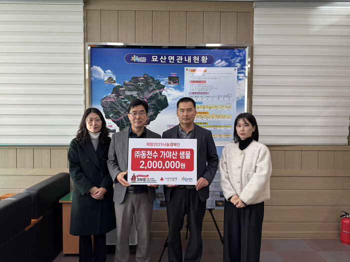 ㈜동천수 가야산샘물은 연말연시 이웃돕기 성금 기탁은 물론, 평소에도 관내에서 진행되는 각종 행사 후원과 합천군 운동부 학생 및 스포츠대회 참가 선수들에게 생수를 무상 지원하는 등 꾸준히 지역 사랑을 실천해왔다.