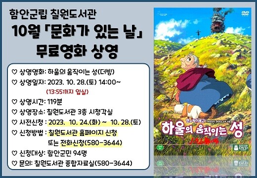 영화는 전체관람가로 누구나 즐길 수 있으며, 관람을 원하는 주민은 28일(토) 오후 2시 칠원도서관 시청각실에서 관람 가능하다.