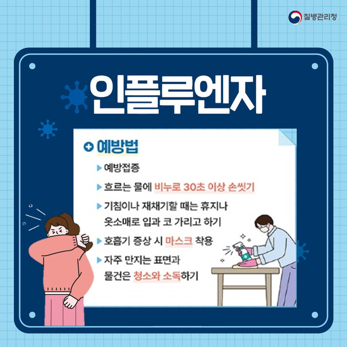 인플루엔자는 호흡기 감염병으로 ▲외출 전·후 손씻기 ▲기침예절 실천 ▲호흡기 증상 발생 시 마스크 착용 ▲밀폐된 공간의 경우 2시간마다 10분 이상 실내 환기 등 예방 수칙의 실천이 중요하다.