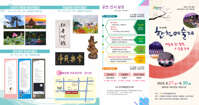 한국예총합천지회(지회장 이점용)가 주최하고, 국악, 문인, 음악, 미술, 사진작가 협회가 주관하는 이번 행사는‘예술은 꿈! 합천, 그 꿈을 꾸다’라는 주제로 진행된다. 전시 행사는 문인협회의 공원시화전과 미술 및 사진작가 협회의 회원전으로 구성되어 다양한 예술작품이 준비되어 있다.