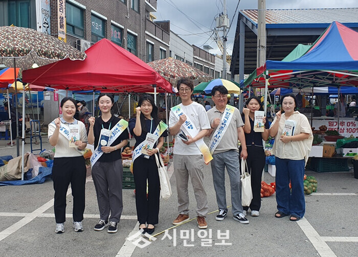| ▲ 한국농어촌공사 해남·완도지사 직원들이 지난 26일 해남읍 고도리 전통 5일시장을 찾은 농업인과 주민들에게 ‘농지이양 은퇴직불사업’홍보 전단지를 배포 한 후 기념촬영을 하고 있다. / 한국농어촌공사 해남·완도지사 제공 |