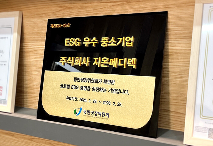 지온메디텍은CJ ENM으로부터 동반성장 협력사 ESG 지원 사업에 선정된 이후 ESG 컨설팅 및 현장실사를 꾸준히 진행하여 진단 항목의 83%를 달성, 종합평가 결과 ESG 우수 중소기업으로 최종 선정됐다.
