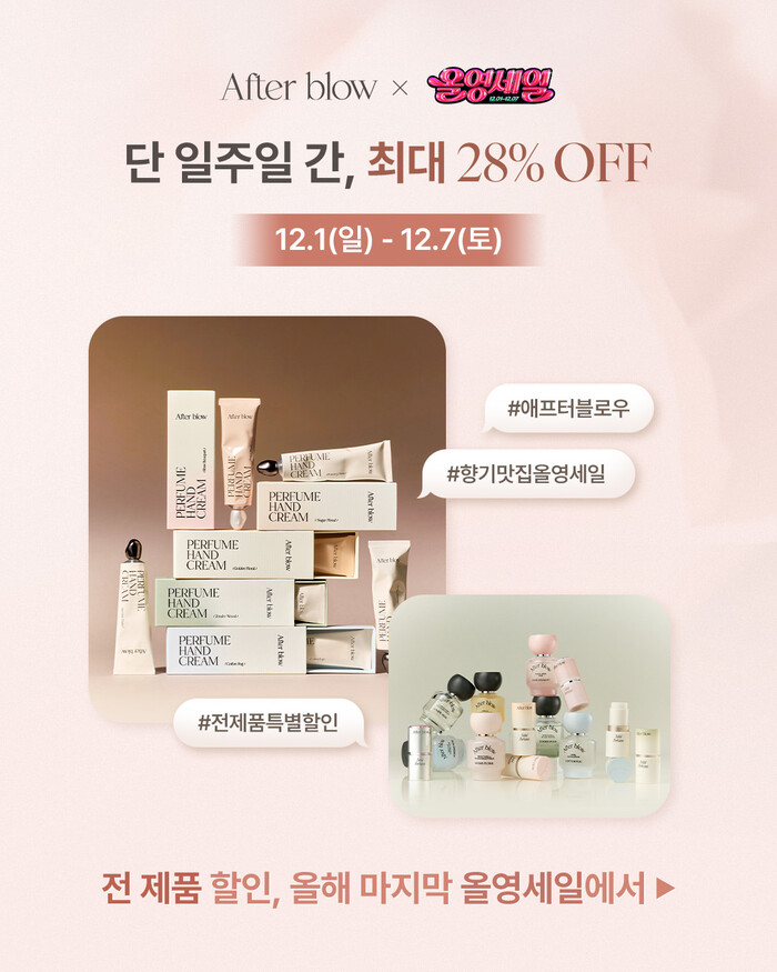 애프터 블로우는 지난 11월 향수/디퓨저 카테고리에서 판매 1위를 기록하며 품절 사태를 겪은 바 있다. 이번 세일 기간 동안 소비자들은 브랜드의 인기 제품을 포함한 향수 전 제품을 할인된 가격으로 만나볼 수 있다.