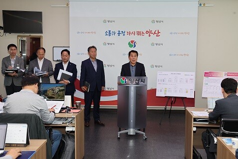 | ▲ 나동연 시장이 브리핑을 하고 있다.(사진=양산시청 제공) |