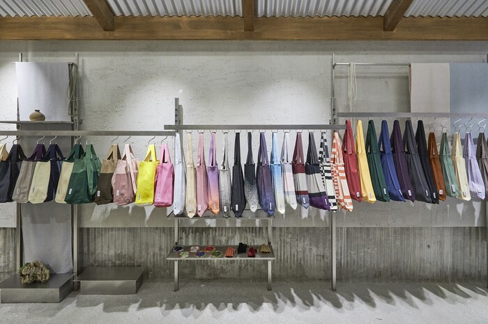 ‘이웃’ 광장점 내부는 ‘저잣거리를 거닐다’라는 콘셉트 아래 주변 환경과 조화롭게 어우러지는 공간 구성에 초점을 맞췄다. 전통적인 분위기가 묻어나는 집기와 양철 지붕 인테리어로 레트로 무드를 자아내고, 벽면에는 플리츠마마 특유의 리사이클링 원사를 사용해 브랜드 아이덴티티를 전달한다. 또한, 지속 가능성을 추구하는 송민재 작가와 협업한 매장 조명과 화병을 함께 만나볼 수 있다.