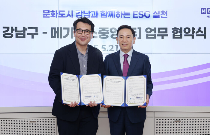 | ▲ 조성명 강남구청장(오른쪽), 메가박스중앙㈜ 남용석 부문대표(왼쪽) |