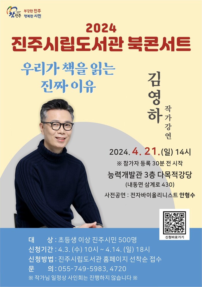 북콘서트는 참여는 4월 3일 오전 10시부터 14일 오후 6시까지 진주시립도서관 홈페이지에서 신청 가능하며, 선착순 500명을 모집한다.