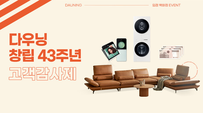 특히, 해당 행사기간에 ‘다우닝’ 제품을 구매한 고객에 한해 약 2천만 원 상담의 경품 추첨 행사도 진행할 예정이라 눈길을 끈다. 경품 상세 품목으로는 비스포크 그랑데 AI 원바디(3명), 갤럭시 Z플립 5 (5명), 백화점 상품권 30만 원(30명)이 있다.