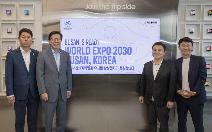 | ▲ 지난 28일 부산 수영구에 위치한 갤럭시 스튜디오 '부산 광안리' 오픈 행사에서 (왼쪽부터) 전봉민 국회의원, 박형준 부산시장, 삼성전자 MX사업부장 노태문 사장, 삼성전자 한국총괄 강봉구 부사장이 기념촬영을 하고 있다.(사진=삼성전자 제공) |
