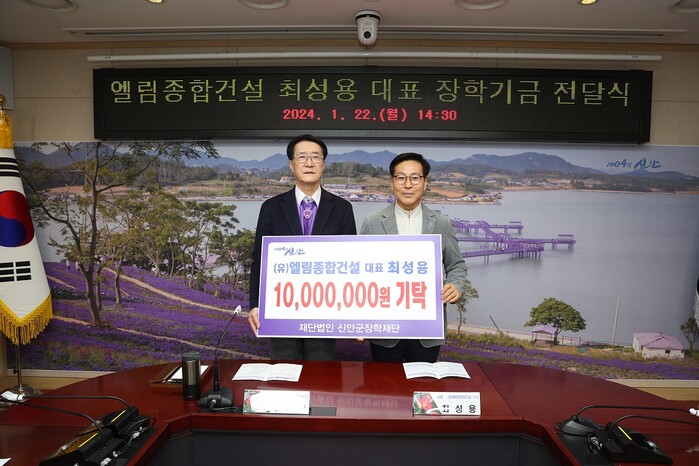 [신안=황승순 기자](재)신안군장학재단(이사장 박우량)은 지난 22일 (유)엘림종합건설 최성용 대표가 신안군청을 방문해 미래 세대 주역인 학생들의 꿈에 조금이나마 보탬을 주고자 1천만 원을 기탁했다고 밝혔다.