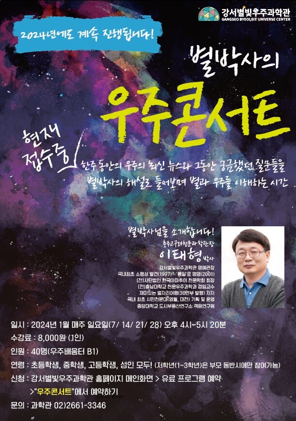 [시민일보 = 홍덕표 기자] 서울 강서구(구청장 진교훈)는 별과 우주의 최신 소식을 들려주고 궁금증을 해결해 주는 '별박사의 우주콘서트'를 진행한다고 2일 밝혔다.
