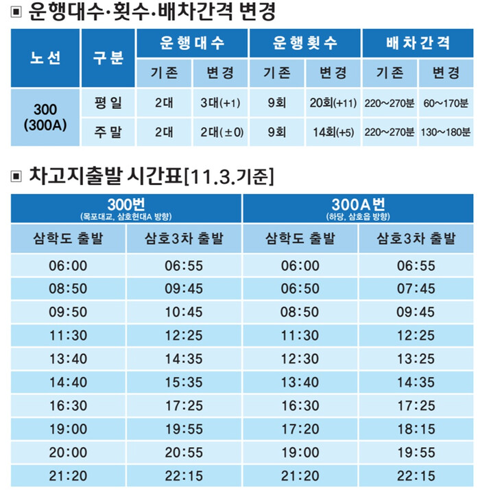 이번 노선 개편으로 11월3일부터 목포시는 목포대교와 삼호현대아파트를 경유하는 300번, 하당과 삼호읍을 오가는 300A번 시내버스를 운행한다.