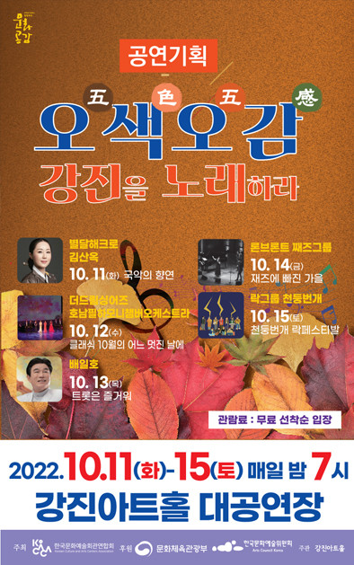 [강진=정찬남 기자] 오는 11일 화요일부터 15일 토요일까지 5일간 매일 밤 7시 강진아트홀 대공연장에서 ‘오색오감-강진을 노래하라’ 공연이 펼쳐진다.