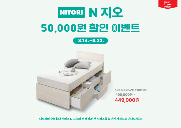지속적으로 증가하고 있는 1인가구를 타겟으로 소형 평수에서 사용하기 좋은 자취생 추천 가구 할인 프로모션도 온/오프라인 매장에서 동시 진행된다. 국내 런칭 이후 계속해서 큰 인기를 얻고 있는 수납형 침대프레임 ‘N지오’ 시리즈를 기간 한정 5만원 할인 혜택을 받을 수 있다.