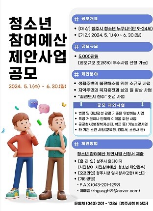 청주시에 거주하는 9세부터 24세까지 청소년 누구나 참여할 수 있으며, 청주시청 홈페이지(시민참여-시민참여예산-청소년 제안사업)를 통해 온라인으로 제안하거나 제안서를 작성해 예산과(청주시 상당구 상당로69번길 38)로 방문, 우편, 팩스로 제출하면 된다.